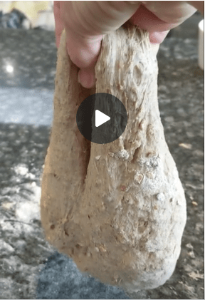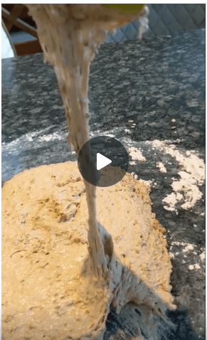 In the second image the dough is much more sticky and wet because the sourdough has started to break down the gluten and it is much shorter in structure – therefore the little microbes have saved your body the effort of some of the process of digestion, this can really help with bloating, IBS and other digestive problems people experience when eating bread. (Full video available on my Facebook)