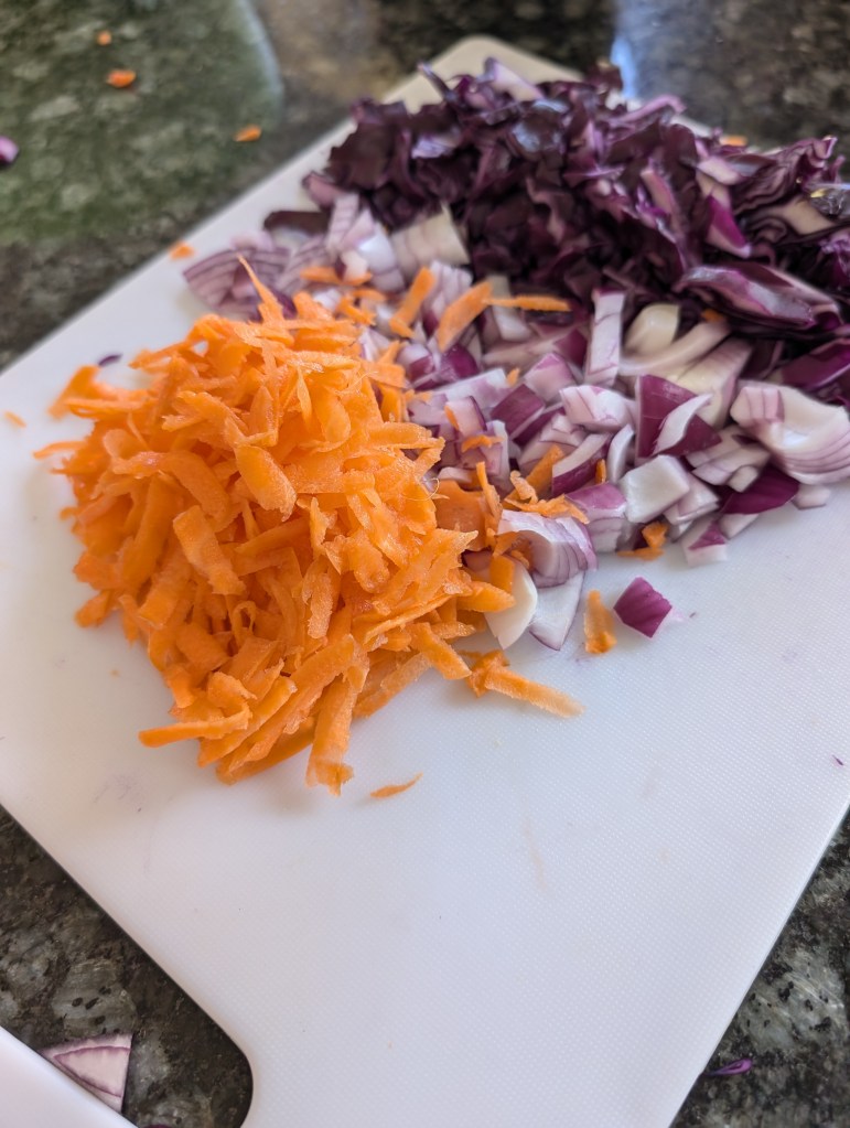 – In a large bowl toss the Cabbage, Onion and Carrot together.
